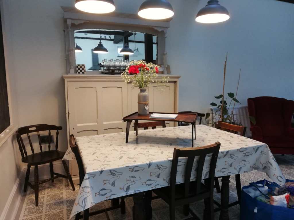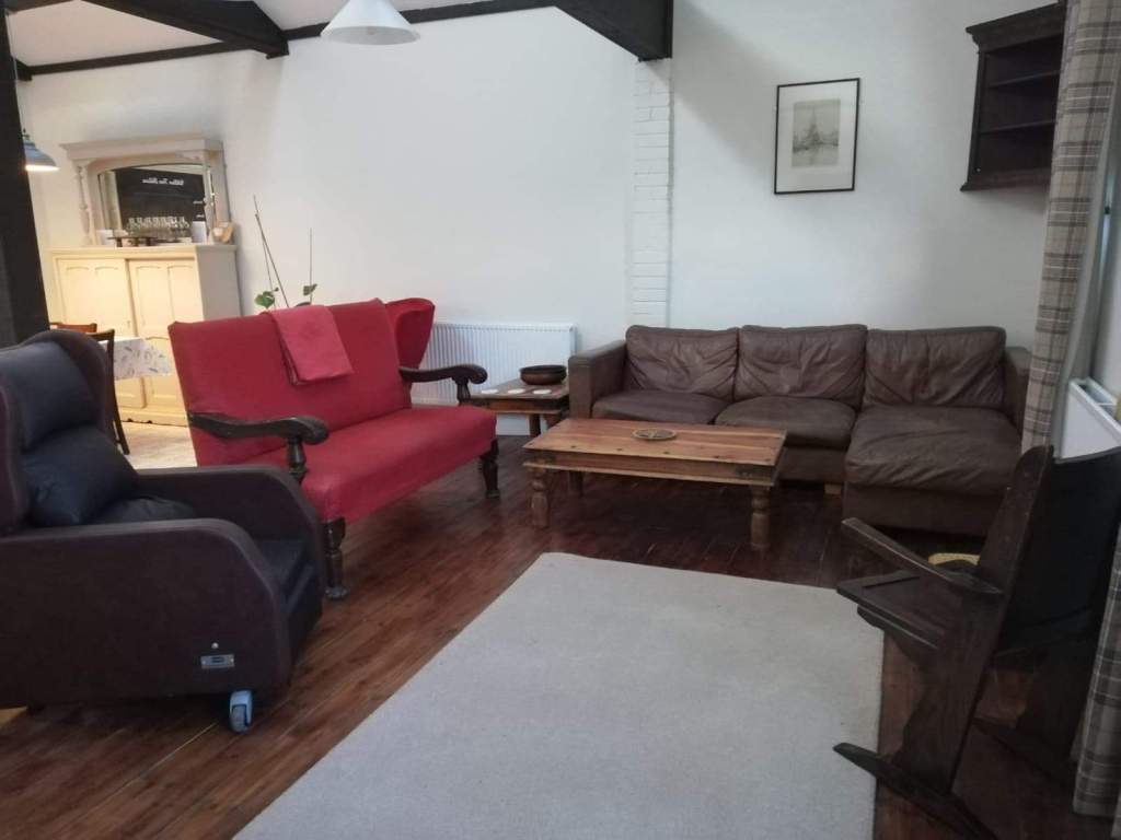 - Living room area has a TV, sofa, adapted arm chair, dining table & chairs