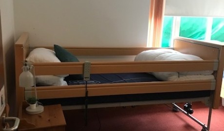 The bedroom has one electric profiling & height adjustable bed & One standard single bed. Additionally there is a Freeway Ceiling Hoist with one large sling provided, the hoist gives access to the profiling bed and the wet room area. The wet room has a fold down shower seat and an option of self propelled shower chairs with commode option, wall mounted bathroom sink with lever taps and fully automatic Clos-o-mat toilet. The ceiling hoist gives access into the wet-room, terminating over the toilet.