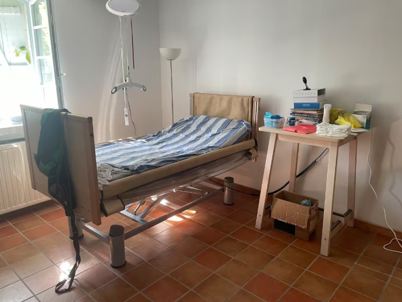 The main house includes six bedrooms and five bathrooms. On the ground floor, there are two bedrooms: one double with an adjacent bathroom and toilet, and a special needs room equipped with rails, a hoist, two profile beds, and cameras. There is also an adapted bathroom with a disabled access shower and toilet.