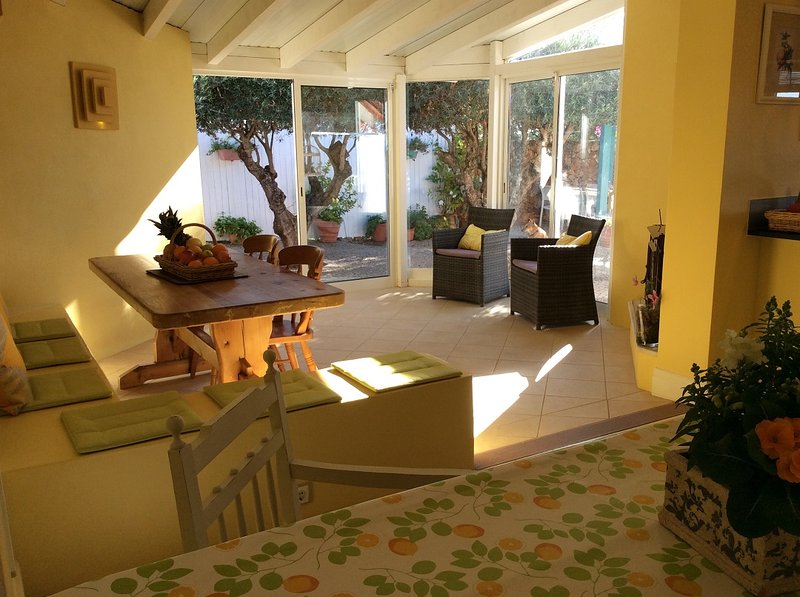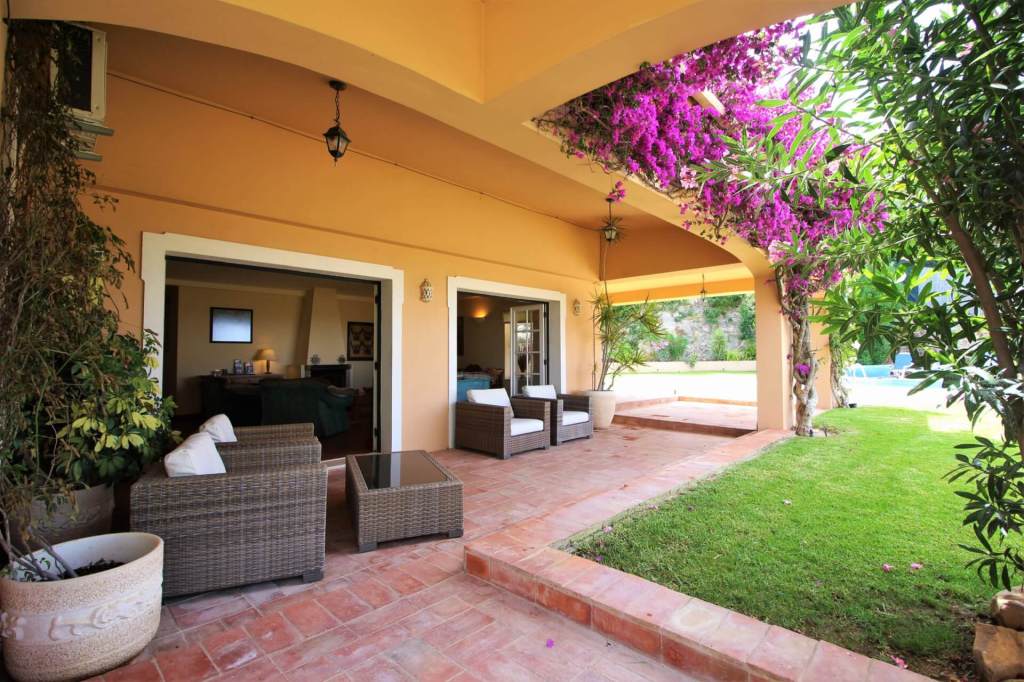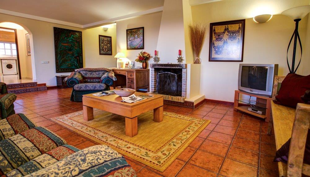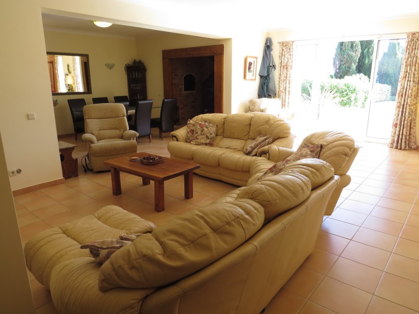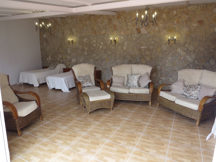 The lounge is light and very spacious 40 m2, with a domed ceiling. The two French windows with four doors each all open onto the terracotta covered terraces, shaded with Bougainvillea, garden and pool areas. The large pool has shallow Roman steps for easier entry. A battery operated pool lift, and underwater pool lights.
