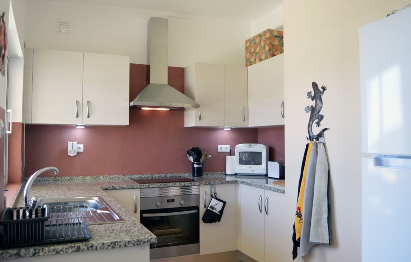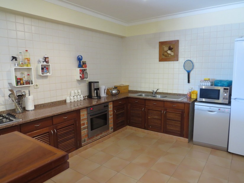 There is a spacious, south-facing living/dining room that opens onto a large terrace with beautiful views. The living area has comfortable seating with a Smart TV and leads to the dining area with large wooden table and chairs for 6 (blocks can be supplied to increase the height of the table). There is free fibre optic WIFI throughout the villa. The villa has a modern, fully equipped kitchen which also opens onto the sun terrace.