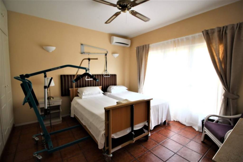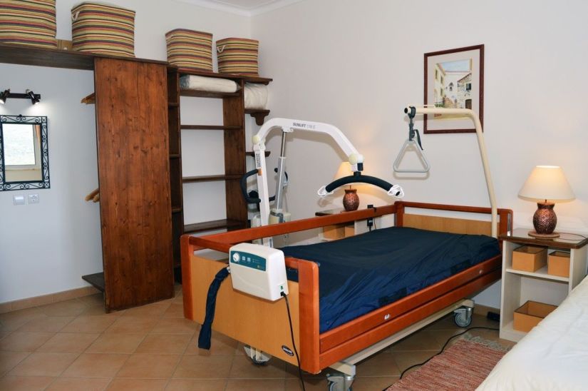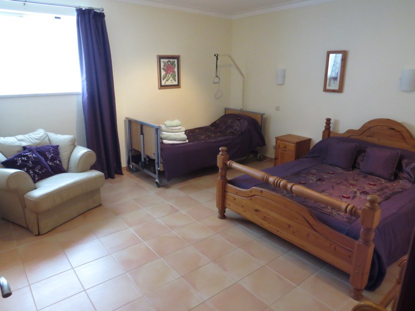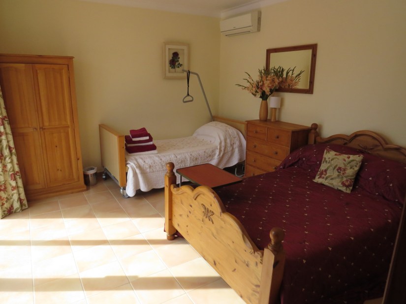 We have three profile beds, an electric indoor hoist, ceiling hoist over the bath in The Garden Suite, shower chairs and commode, sliding access doors, wet-room bathrooms, heightened tables for access, a pool hoist for sling or chair entry into the solar heated pool.
