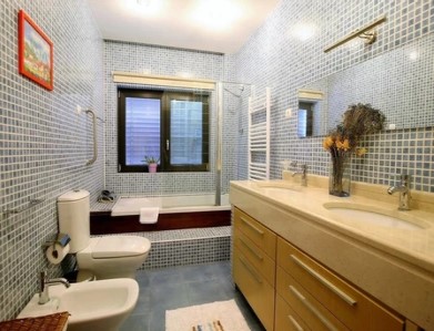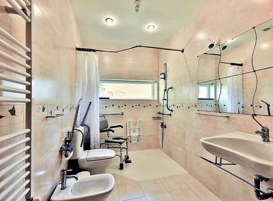 One of the spacious bedrooms and en-suite bathrooms has been adapted especially for wheelchair users. This light and large bedroom has 4m wide French windows leading out onto a terracotta pathway, garden and pool area. With 90 cm wide clear door openings & overhead bed grab bar attached to the wall. The wardrobe has a lower hanging rail and shelves, remote controls for the air conditioning/heating and a safe.