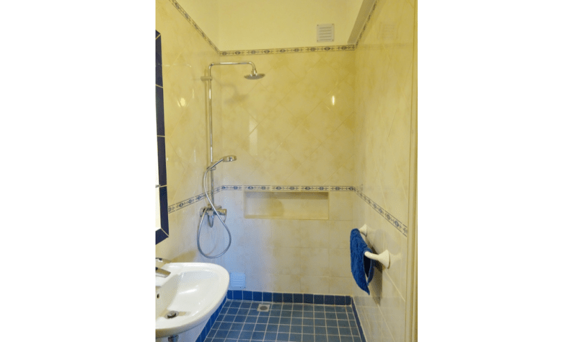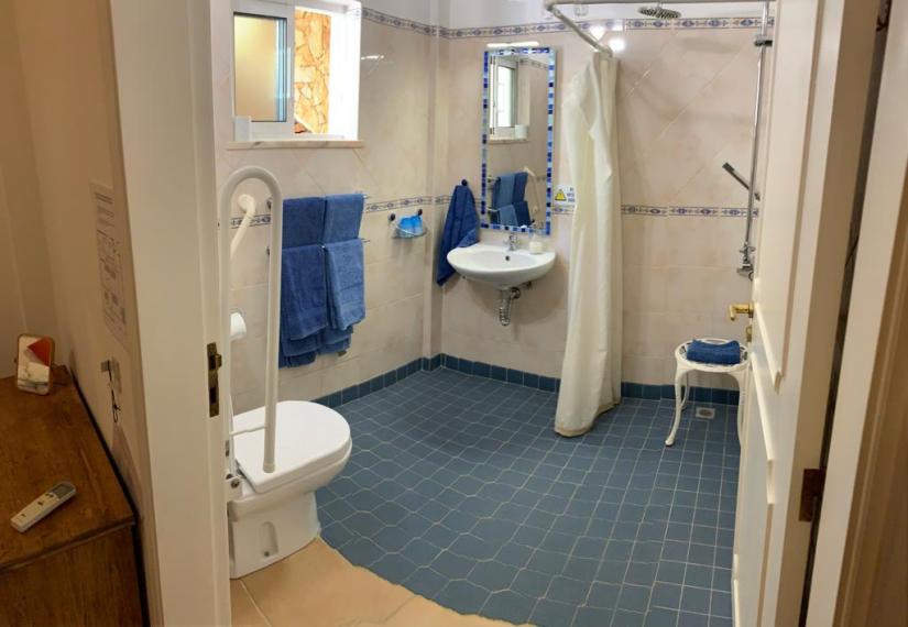 The en suite bathroom has also been adapted for wheelchair users, a level access shower room with two grab rails. The W.C. with support grab rails both sides, and a toilet raiser if needed. There is plenty of space under the sink for a wheelchair, and a lower mirror. Kept at the villa is a shower chair/commode chair with arms that lift up for easier transfers, also a shower trolley. Other equipment can be rented & delivered to the villa for your arrival.