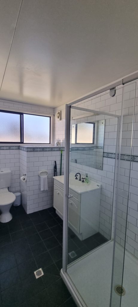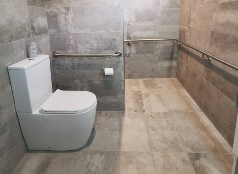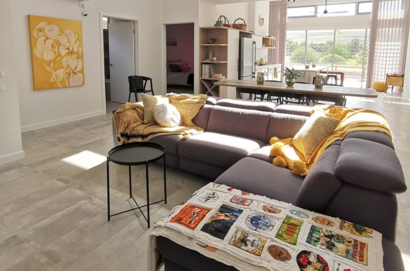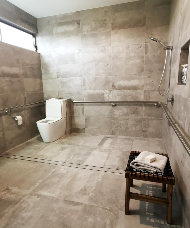 Our 3 fully tiled bathrooms have all the usual mod cons, and one, is specifically designed with grab rails, flat floors and a double-width doorway accommodating wheelchair users. The kitchen is user friendly and features an island bar, soft-closing drawers, and modern appliances including a dishwasher. All small appliances are included. The dining area has a large dining table and seating for 10. The lounge area has a modern, comfortable lounge-suite, mounted television with Wi-Fi capability, and a Bluetooth music system with speaker control. We are also able to supply electric hospital-style beds, mobile hoist (BYO sling), and shower chairs/commodes, all at no extra charge.