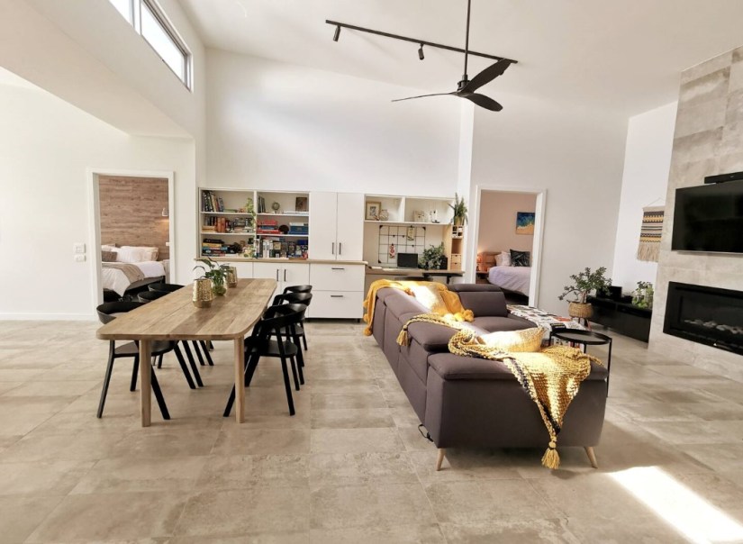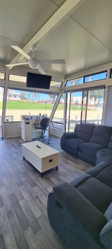 - Lounge area has a Smart TV, sound bar, sofa and dining table