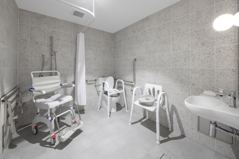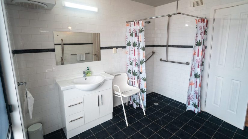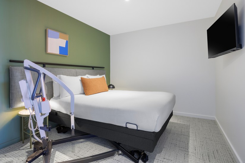 You’ll feel right at home in Quest’s stylish One Bedroom Apartment. You’ve space to move with a separate bedroom with a king-size bed and wardrobe, a relaxed living area with sofa and LCD TV plus a fully equipped kitchen including glide under bench, draw dishwasher, easy pour tipping kettle and sensor bin. The European-style laundry includes a washer-dryer combo. The modern bathrooms have all the amenities you need for a comfortable stay. We have one apartment that also includes a high-low electric bed, hoist and a commode chair for shower and toilet and has been independently accredited to meet the needs of an assisted wheelchair user where a person is unable to lift themselves and requires the assistance of a Carer or Support Worker.