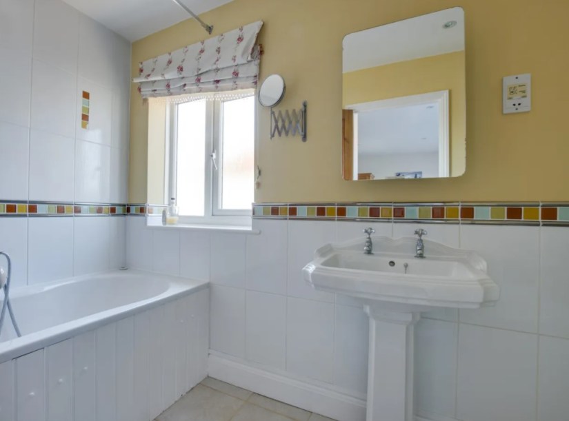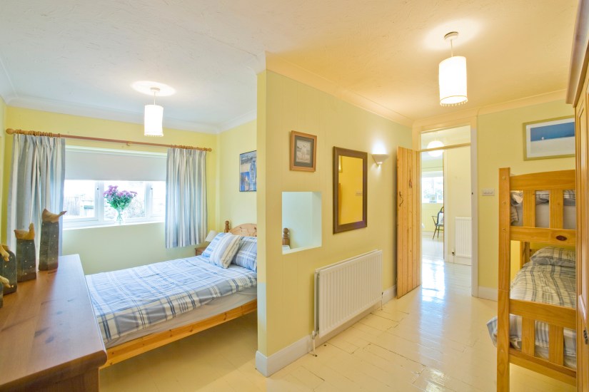 The wet room has a shower, optional shower table and shower chair and WC with side bars for those who may have accessibility issues. The hand basin is small for normal use but is designed to be at the correct height for wheelchair users and enables the wall-mounted shower table to fold down when required. The other ground floor bedroom has a full sized hand basin with mirror and shaving socket. It is a family-sized bedroom, having a double bed and a set of adult sized bunk beds.