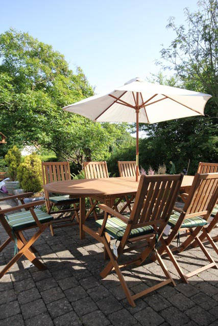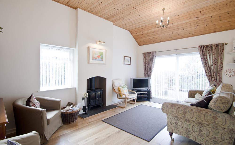 The comfortable sitting room with its oak flooring and log burner has been arranged to allow wheelchair access and is an appealing bright room overlooking the terrace that you can access through double sliding doors. The terrace has patio furniture and a BBQ for al fresco dining.