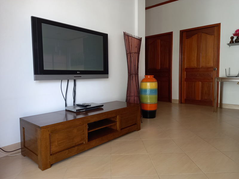 - Living area has a sofa, dining table, Sound system & 65″ Satellite TV