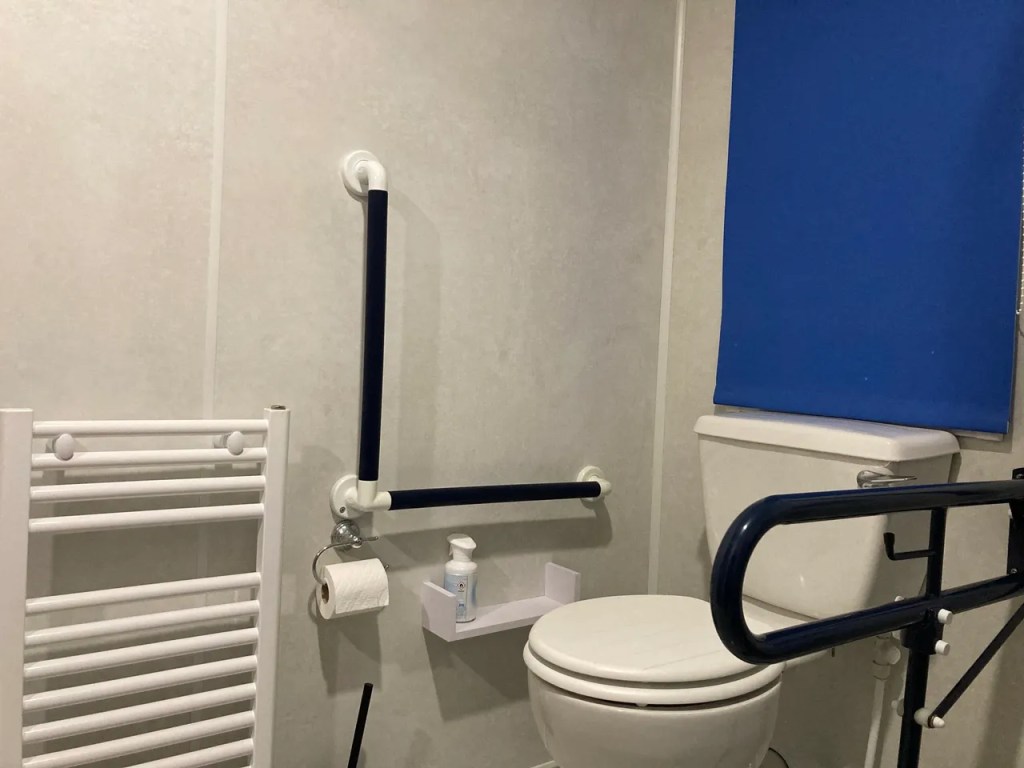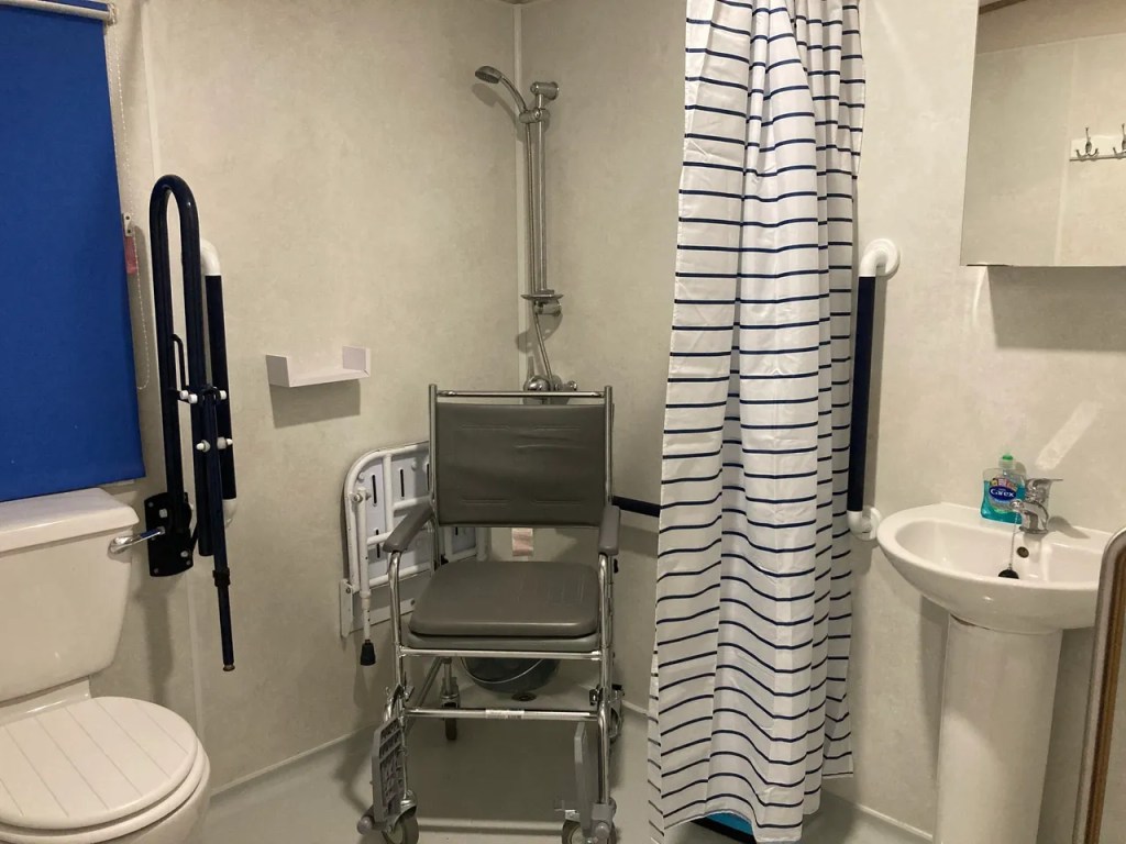 For bathing there is a large wet room, thermostatic controlled “super powerful” shower with extra long hose and a wheel in shower chair. There are fixed hand rails in the shower area, and by the sink, with 1 fixed and one drop down rail by the toilet.