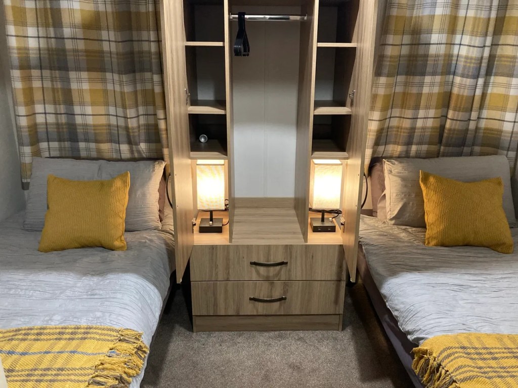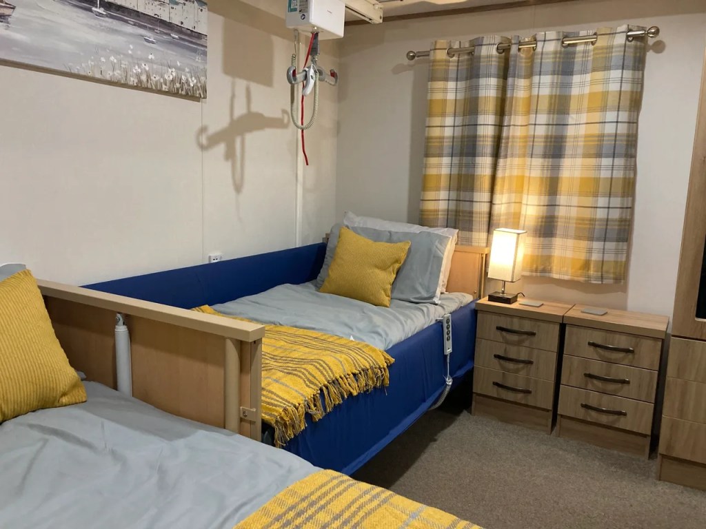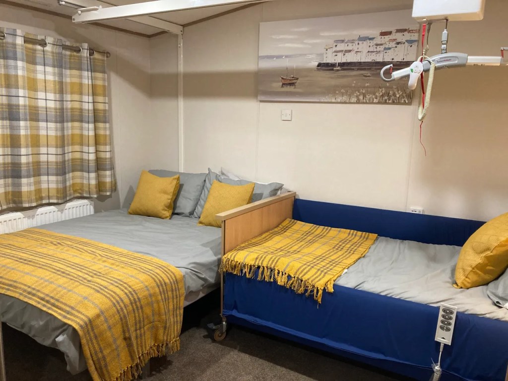 The master bedrooms are larger than you would normally find in a static caravan with a single profiling bed as well as a standard double bed and 2 double wardrobes, and 4 USB charging points. There is also a full room coverage overhead track hoist system. This room is easily reconfigured to give best access to meet your specific requirements.