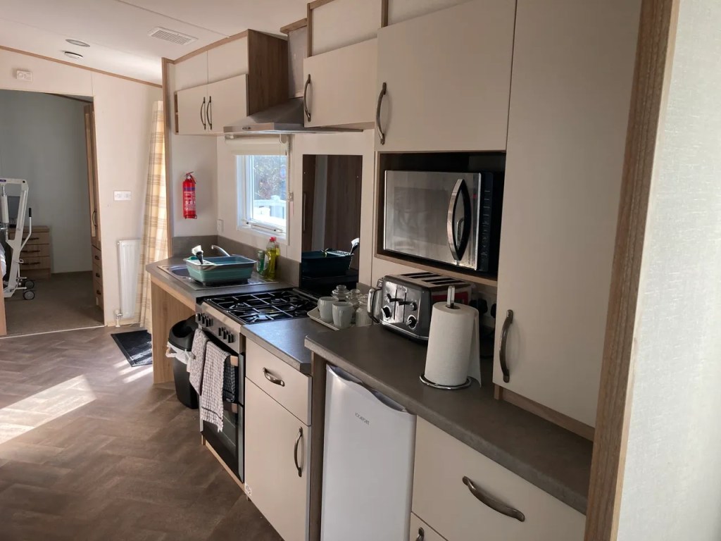 - Kitchen has a microwave, gas oven & hob, slow cooker, kettle & fridge / freezer