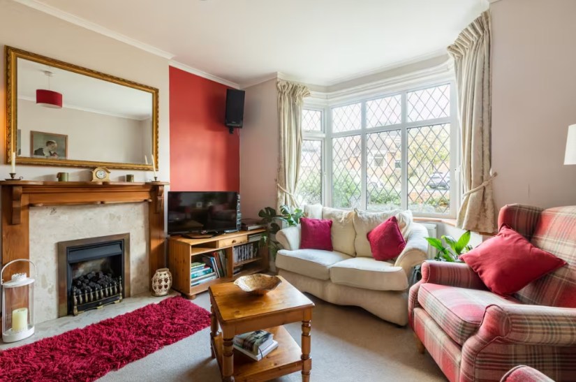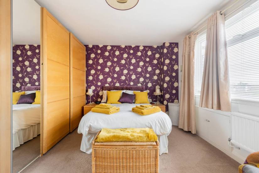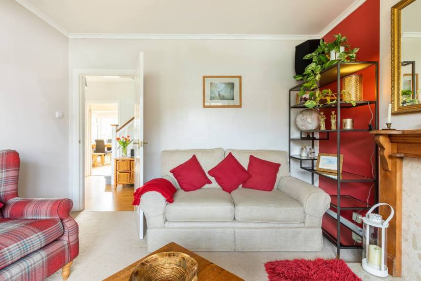 The kitchen and dining area is bright, light and homely. Great for socialising & self-catering after days out! There is a large fridge freezer, gas hob, electric fan oven below, coffee maker, dishwasher, washing machine and tumble drier. In the dining room is a wood burner, TV, leather sofa, chairs, together with an extendable table seating up to eight. In the Summer this is a lovely space with a sliding door onto the patio where you can breakfast in the sun! The lounge at the front of the house is a comfortable room with two sofas, arm chairs and a smart TV with DVD player.