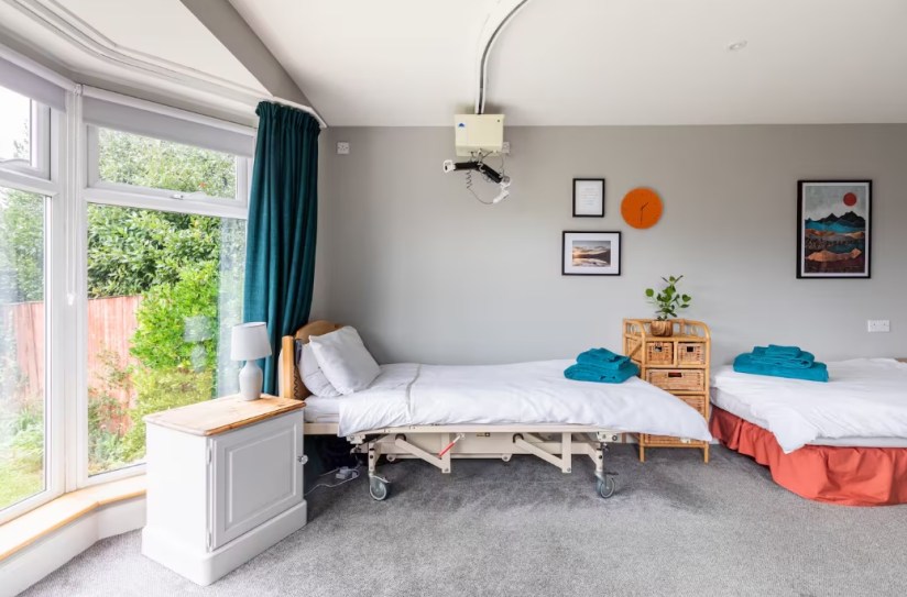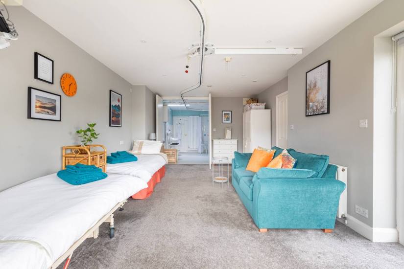 The ground floor has been tastefully adapted for a wheelchair user with wider doorways and level access onto the patio through the large ground floor bedroom, enjoying a low bay window overlooking the garden. It has a large Smart TV and a 2 seater sofa in to relax! This bedroom has an overhead hoist system from bed to the en-suite bathroom. The bed is electrical height-adjustable with optional bed rails should they be required. The large bathroom is a wet room with walk-in level power shower, toilet (with portable surround) 2 sinks, a changing table and plenty of space. A shower chair/stool can also be provided. Upstairs there is a large double bedroom with vanity sink area and a twin bedroom next to a shower room and toilet.