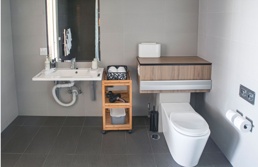 Enjoy the communal kitchen bench area or sit outside on the adjacent balcony overlooking Collaroy Beach. All of the elements of our kitchen are thoughtfully designed to facilitate cooking with a spinal cord injury, including limited hand function. Trial the latest in adapted cooking utensils and appliances, such as our electronic height-adjustable benches, Thermomix and professional barista machine.