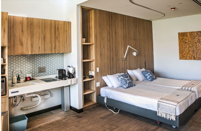 - Kitchenette has a height adjustable sink, benchtop and hob