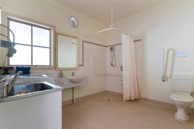Wheelies Rest is run by Muscular Dystrophy Australia and is a purpose built accessible 4 bedroom villa on Phillip Island sleeping 11. One of the twin bedrooms has a ceiling track hoist above the two electric hi-lo single beds. The separate wet room doesn’t have a ceiling hoist but they do provide a manual hoist for hoisting onto the wheeled shower chair or commode. The kitchen has space under the hob and sink for chair users and there’s a large open plan living area. Outside there’s a BBQ and sitting area.