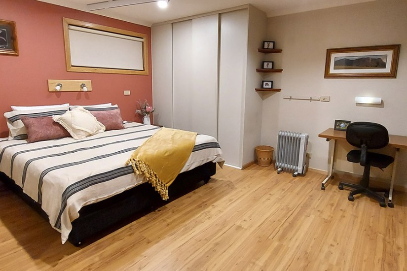 Shady Gums has all the modern features that you would need including – full kitchen facilities, 2 bedrooms, 2 bathrooms, free wifi (limited) and laundry facilities. The large open plan kitchen/living area overlooks the creek and is heated by a slow combustion wood heater. It Also has a reverse cycle Air conditioner for cooling in summer. Accessible facilities include an accessible parking space, ramped access, ceiling track hoist access to the bed and spa bath (please request at the time of booking), wet-room with wheel in shower, wheeled shower chair and a hi-lo double/twin beds in the main bedroom.