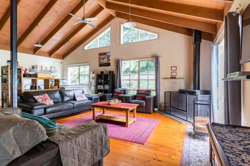 - Living room has a TV, DVD player, wood-fired stove, 2 sofas & dining table