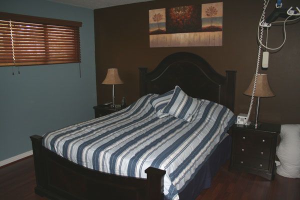 The master bedroom has plenty of space to manoeuvre a wheelchair and has a large closet to store medical supplies, equipment and clothes. The twin electric profiling beds can be separated and side rails fitted if required. The track for the electronic ceiling hoist is positioned for use over the beds and passes straight in to the en-suite wet room.