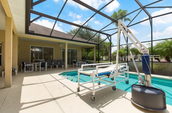 The villas have a 28 x 15ft pool with a large deck area and screen plus plenty of comfortable chairs and recliners to relax on. At night the underwater floodlighting illuminates both pools. The deck area also has a fence to safeguard children from accessing the pool. The pool has an electric pool hoist with interchangeable chair or bed. There are also ramps leading into the living room, the master bedroom downstairs and the pool shower room/toilet from the pool deck to the house.