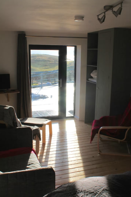 - Bedroom/sitting room with double bed, chairs & a small TV