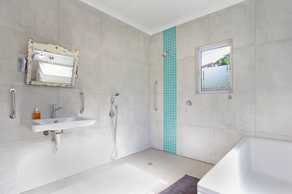 The accessible bedroom and bathroom has a continuous, level polished concrete floor from the hall for ease of use with a wheelchair. The double doors open out to a ramped deck with further ramped access to the pool area where a pool hoist is located. The ceiling hoist goes right from the bed to the bath, passing over the toilet (although we have Rifton Blue Wave toilet chairs available). In the bathroom we have installed a wheelchair accessible basin with a large handle tap and roll in style wet room shower with large handle shower controls and rails to aid standing. Both the bath and the shower have additional attendant shower heads.